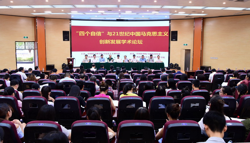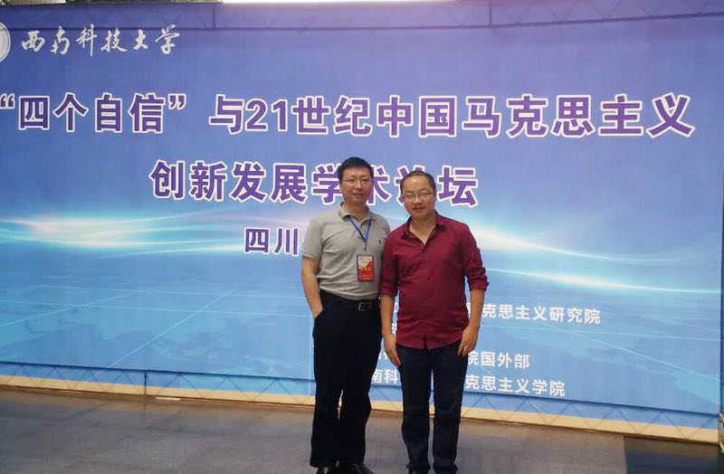 共同承办的全国“‘四个自信’与21世纪中国马克思主义创新发展”学术论坛在西南科技大学举行。来自中国社会科学院、北京大学、武汉大学、四川大学等60余所高等院校和科研机构的160余名专家学者参加会议。中国社会科学院马克思主义研究院党委书记、院长邓纯东,中共绵阳市市委常委、宣传部部长张学明,西南科技大学副校长陈朝先,人民日报理论部、四川省社会科学界联合会、绵阳市社会科学界联合会相关领导出席会议。我院吕进副教授、魏强副教授应邀参加会议。