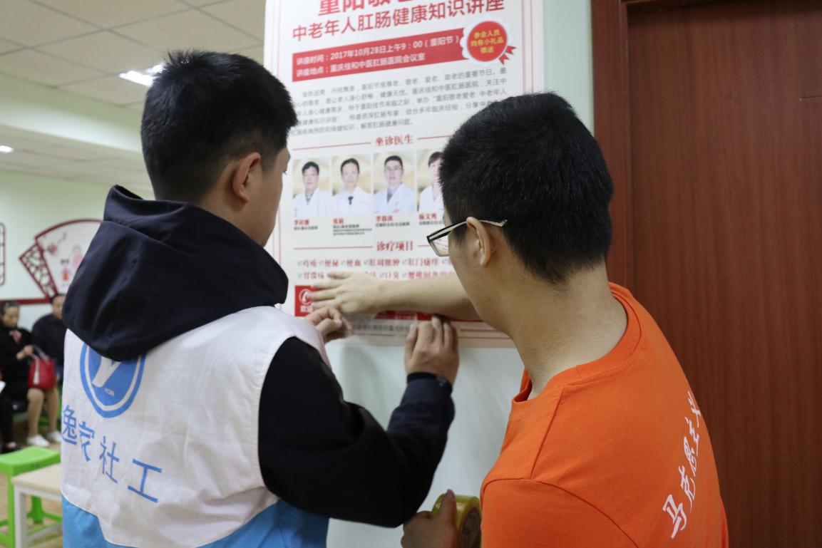 (志愿者们张贴健康宣传报,并协助医生帮助老人体检)