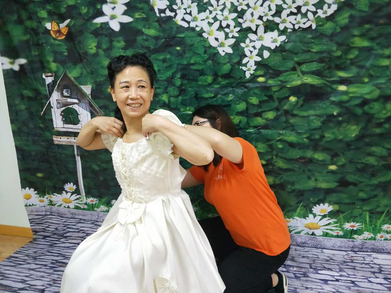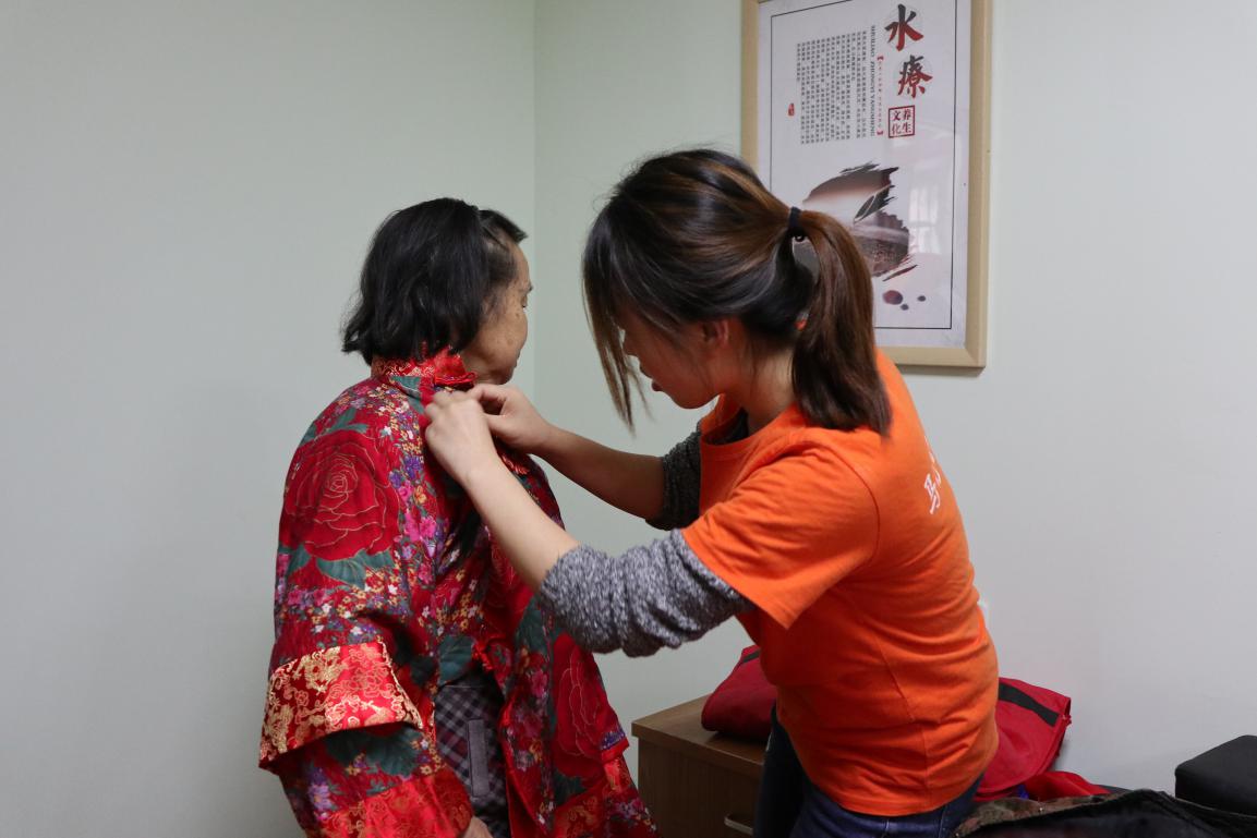 (志愿者们帮助老人穿上美丽的衣服)