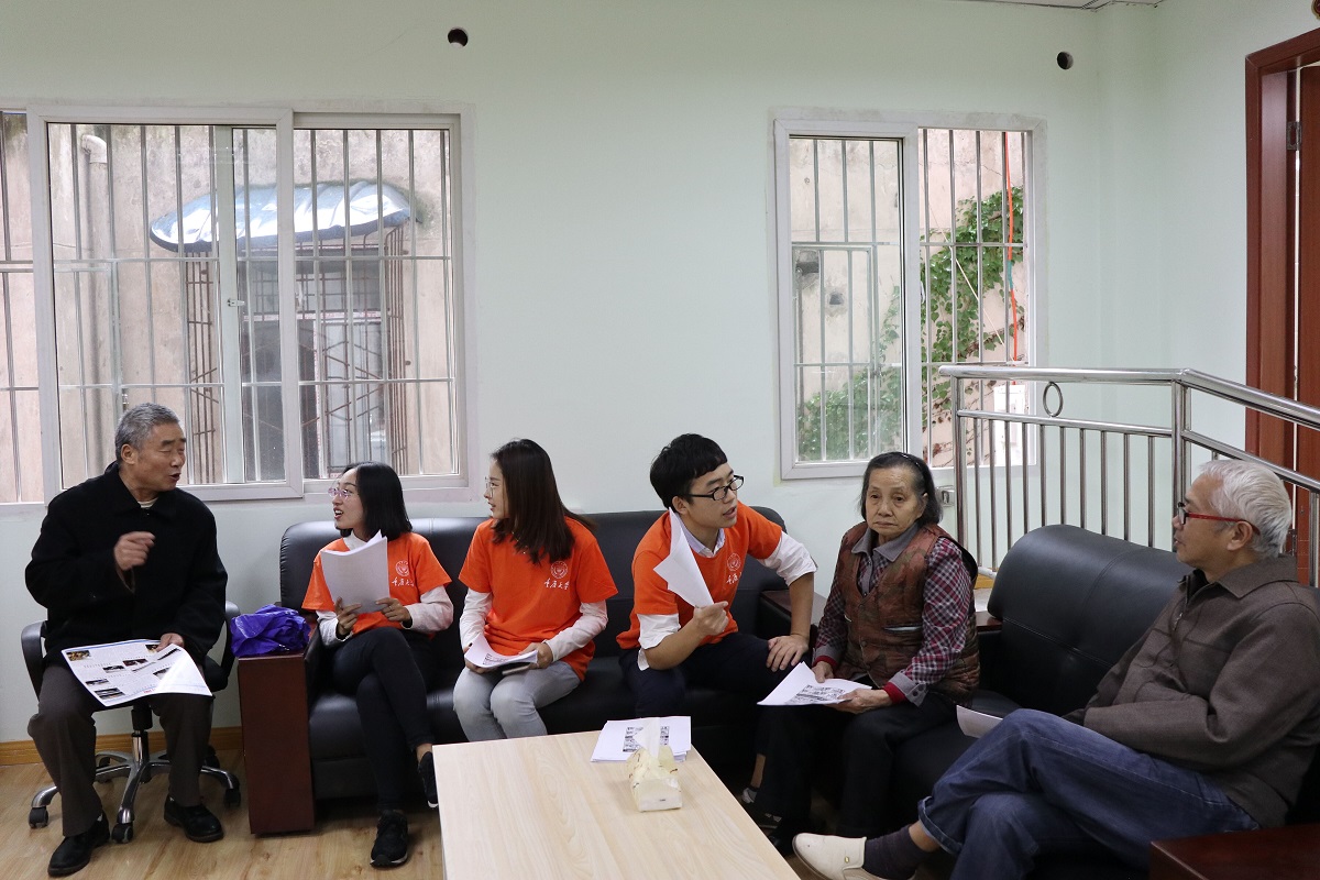 (志愿者正在和老人们聊天)