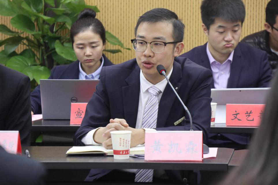 第四项,校研究生主席黄凯霖做总结发言。他谈到“今天我们欢聚一堂、同谋发展,学习交流十九大精神、通报本学期工作规划、第二次研代会及元旦晚会的筹办工作,将有效助推本学期重点工作的开展;会议讨论了如何更好维护学生合法权益,为校园民主建设集思广益,出谋划策,希望在今后的工作开展中,各二级学院研究生会能够继续加强协调,相互配合。”他指出,此后我们应开展一系列传承重大精神、富有时代特色、立足自身发展、立志青春奉献的活动,为广大研究生搭建一个展示青春风采、提高综合素质的平台,努力实现探花视频