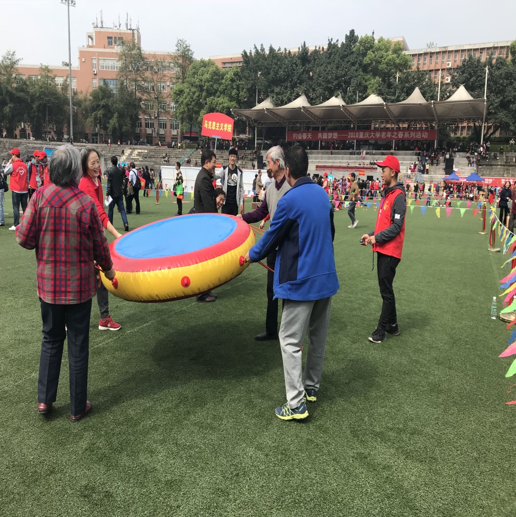 我院离退休代表队先在思群广场观看了精彩的广场舞表演,欣赏了各位同事和朋友为大家带来的优美舞姿,聆听了悦耳的律动。接着老师们来到趣味运动会“众星捧月”项目的比赛场地,大家精神抖擞,热情高涨。在裁判和志愿者的引导下,老师们认真地练了起来。杨德林、余曙光、古灿芳、梁复荣四位老师分别拉住充气球的把手,许龙、郭孝菊和高燕丽老师在旁边负责捡拾及放置活力球,宋钦和及其他老师在旁边为队员们呐喊助威。经过简单的训练,老师们以两分钟73个的好成绩完成了比赛。最后大家意犹未尽,表示下次还要再接再厉。