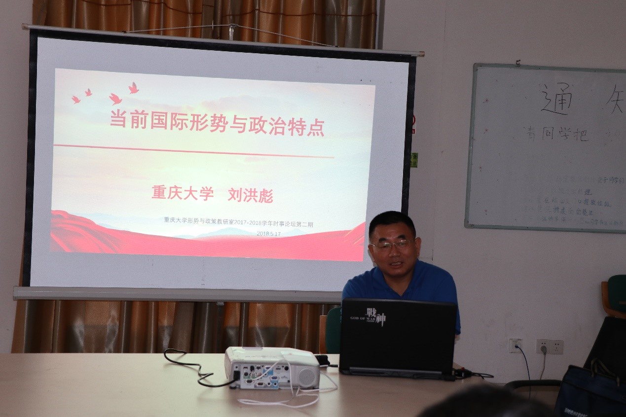 2018年5月17日下午2点,由形势与政策课教研室主办的第十一期“时事论坛”如期在虎溪校区梅园二栋党团活动室举行,本次论坛邀请学院刘洪彪教授为来自全校不同学院的学生作了题为“当前国际形势与政治的特点”的讲座。