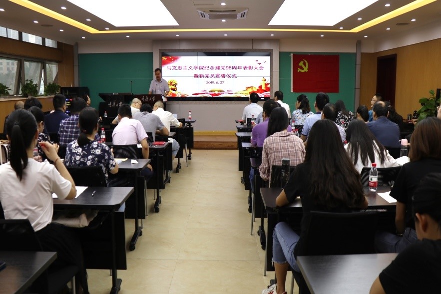 2019年6月27日,探花视频 在408会议室隆重举行纪念建党98周年表彰大会暨新党员宣誓仪式。探花视频 院长张邦辉、副院长徐鲲、吕进及学院全体师生党员参加了表彰大会,会议由学院党委副书记温健琳主持。