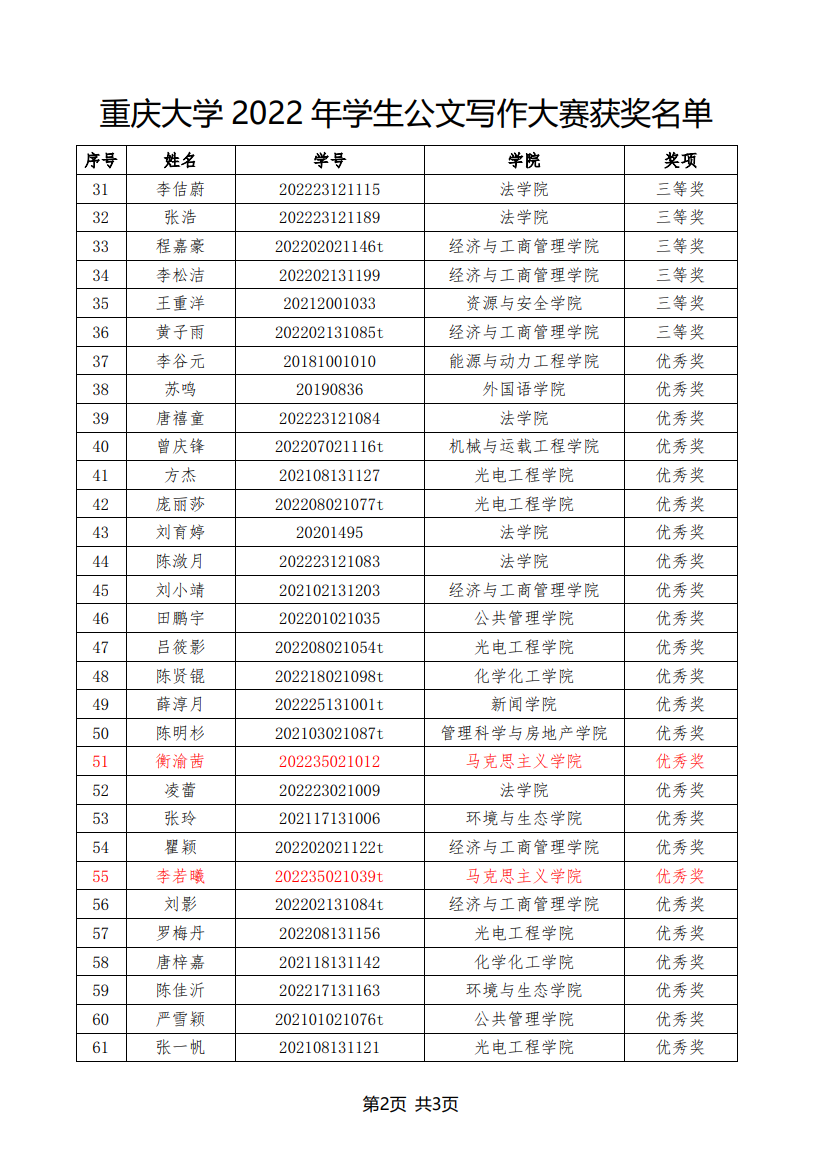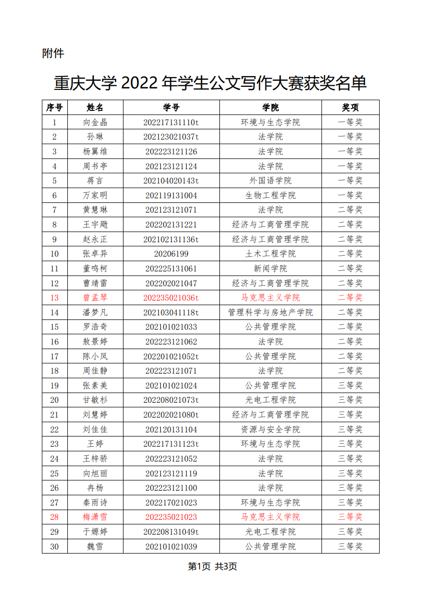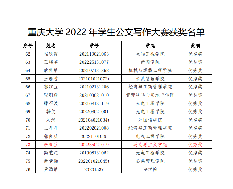 在2022年11月至12月举办的“志公博学,明文定理”探花视频 2022年公文写作大赛中,我院曾孟琴等5名研究生获奖,获奖名单如下:
