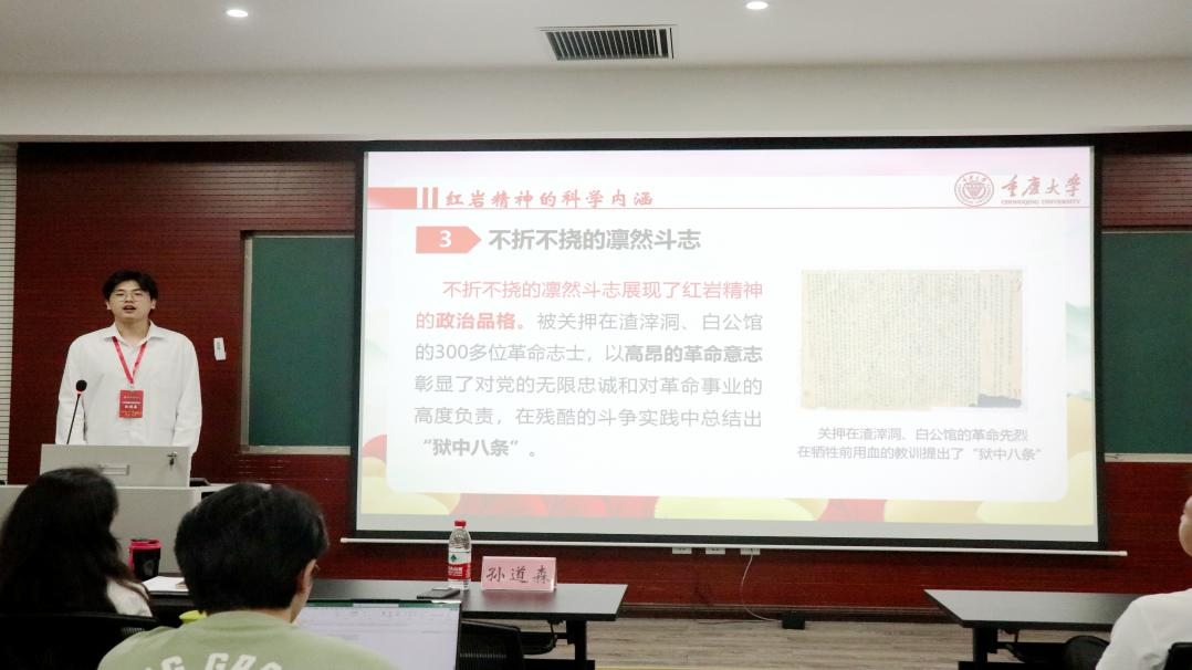 随后,活动进入主题宣讲环节。文心雨以《忆革命英魂传红岩精神》为题,深情回顾了红岩先烈们的英勇事迹和坚定信念。她以中共中央南方局在红岩结庐为起点,讲述了红岩精神的灵魂性人物周恩来同志的卓越贡献。并通过视频为同学们立体地展现了江竹筠、小萝卜头以及刘国鋕等先烈在敌人残酷迫害下,坚守信仰、不屈斗争的壮烈故事。