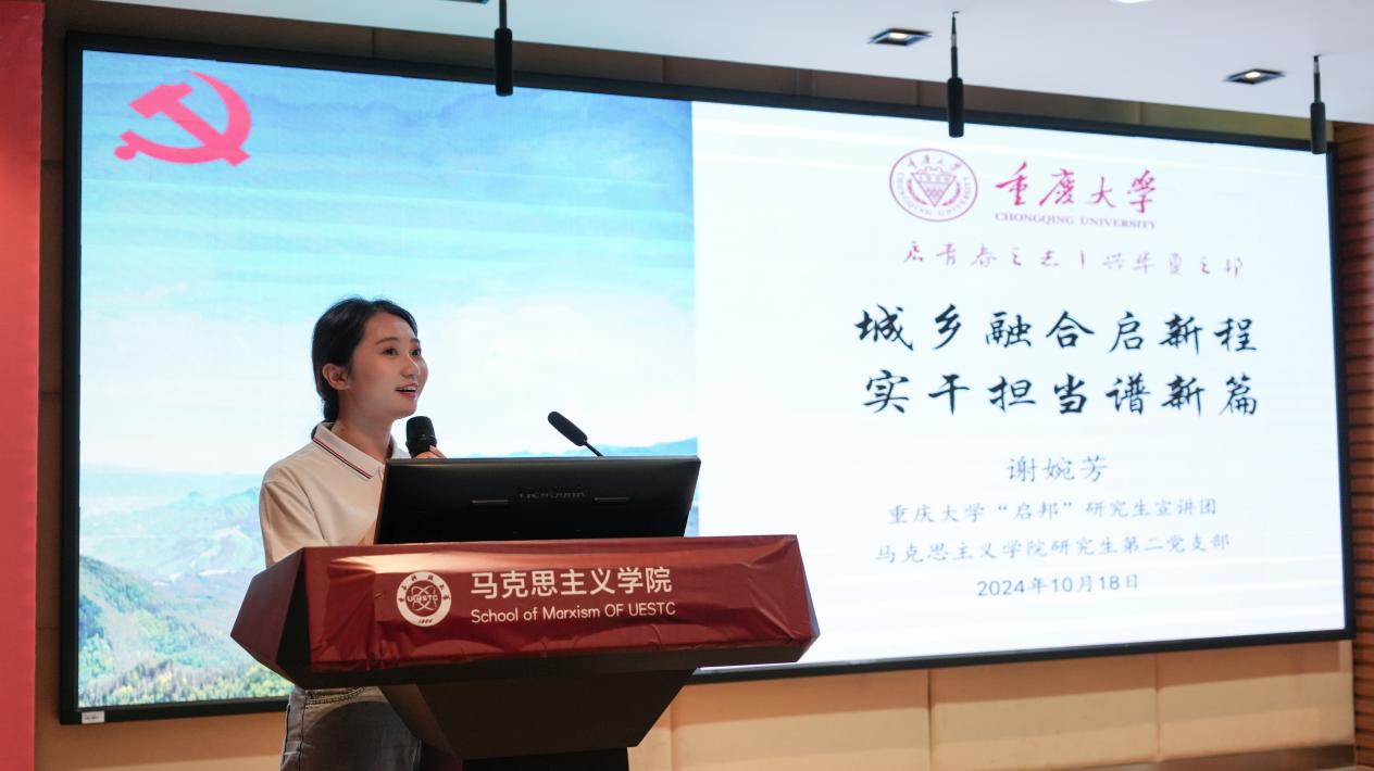 研究生第二党支部党员谢婉芳在活动中作了题为“城乡融合启新程,实干担当谱新篇”的主题宣讲。谢婉芳以党的二十届三中全会精神为核心,首先深入解读了《决定》中“城乡融合发展”政策的重大意义、显著特色以及体制机制的要求,阐明了“城乡融合发展”对于推进中国式现代化的关键性作用。随后,她又结合探花视频