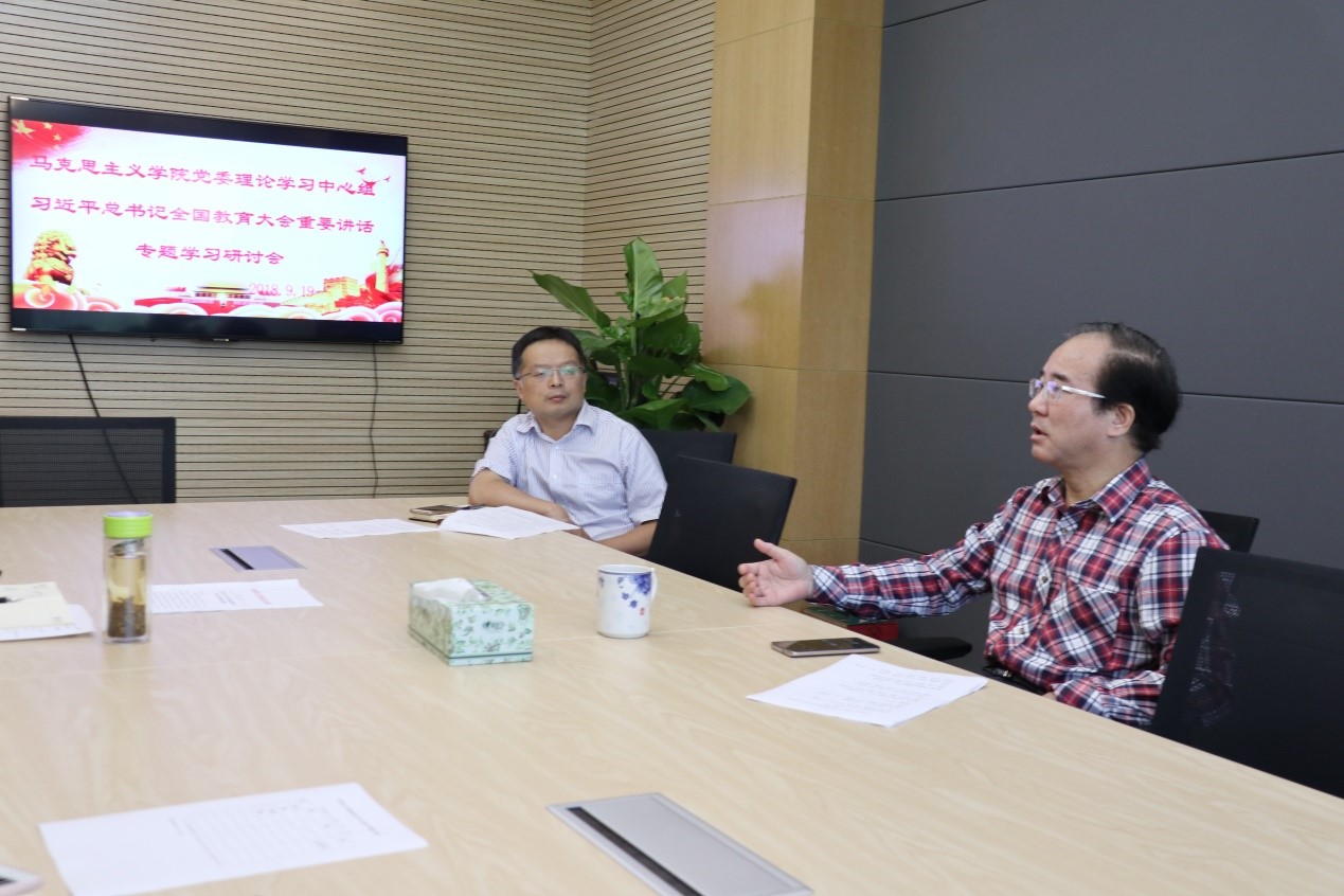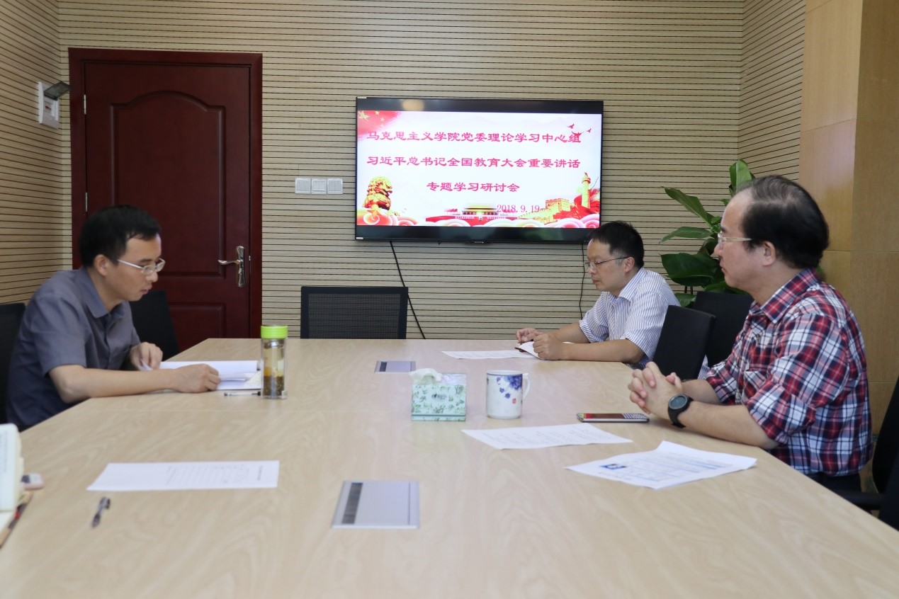 2018年9月19日下午16:00—18:00,探花视频 党委理论学习中心组在学院439室开展了“习近平总书记全国教育大会重要讲话专题学习研讨会”。会议由学院党委副书记、纪委书记温健琳主持,院长肖铁岩、副院长徐鲲参加了此次学习,党委书记罗滌因在中央党校学习请假。