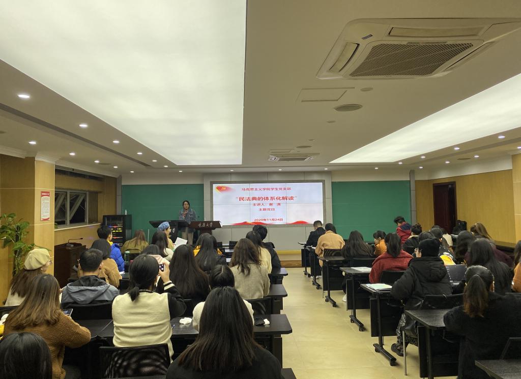 2020年11月24日晚19点,我院2019级研究生党支部、2020级研究生一支部、二支部在学院408教室联合进行“民法典的体系化解读”主题党日学习,活动特邀我校法学院谢潇副教授为大家进行讲课。学习活动由陈娜老师主持,周志永老师、张守新老师、2019级、2020级全体党员以及入党积极分子参加学习。