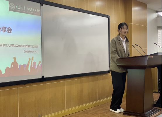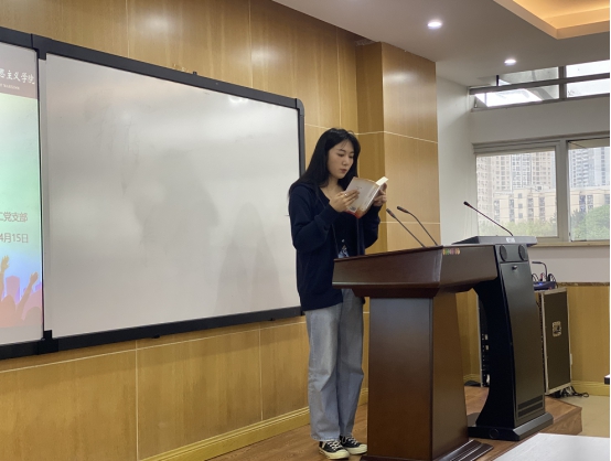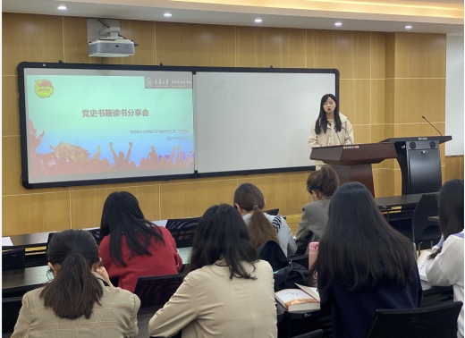 周玲玉同学谈到:“感谢党支部能够给我们这样的机会来分享我阅读党史相关书籍的感悟。无数中国共产党前辈们,用自己的血肉,成就了我们的新中国。我们的今天来之不易,没有中国共产党的领导,就没有新中国。作为接班人的我们,更要牢记党史,以史为鉴,始终以党的先进性来要求自己,将自己的命运和党的发展紧密结合起来!”