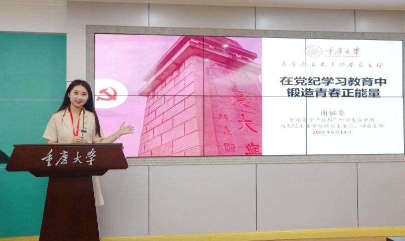 研究生党支部举办的“学党纪·打头阵·做先锋”——川渝双一流高校学子“党纪学习教育”主题联学活动,马院研究生三支部党员谢婉芳在活动中作主题宣讲。