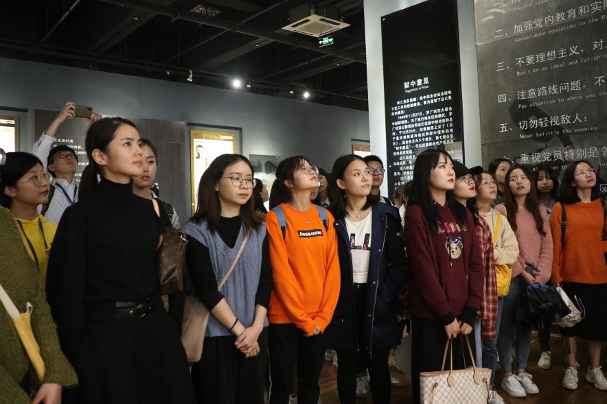 接着,同学们徒步前行,拾阶而上抵达白公馆。这样一座“活棺材”曾囚禁着抗日爱国将领黄显声、同济大学校长周均时、爱国人士廖承志、共产党员宋绮云、徐林侠夫妇及幼子“小萝卜头”……在白公馆的二楼,一面别样的五星红旗引来不少同学驻足观看。据了解,这是当时被关押其中的共产党员们为庆祝新中国成立用被面、米饭、草纸做成的红旗,他们身陷囹圄却憧憬着新中国的曙光,崇高的理想信念在同学们的灵魂深处久久激荡。