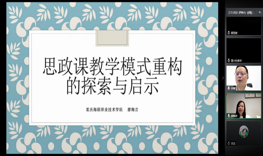 第三位发言的教师是来自重庆海联职业技术学院思政课教研部的廖梅吉。她发言的题目是“思政课教学模式与重构:探索与启示”。她介绍了面对新冠肺炎疫情,重庆海联思政部组织线上教学技能培训,提高教师线上教学能力;设计线上教学流程,充分发挥教师主导与学生主体作用的具体做法。教师始终保持了不断学习的状态;及时调整教学方式,真正做到了“停课不停教,停课不停学”,“教学进度不拖后、教学质量不降低”。