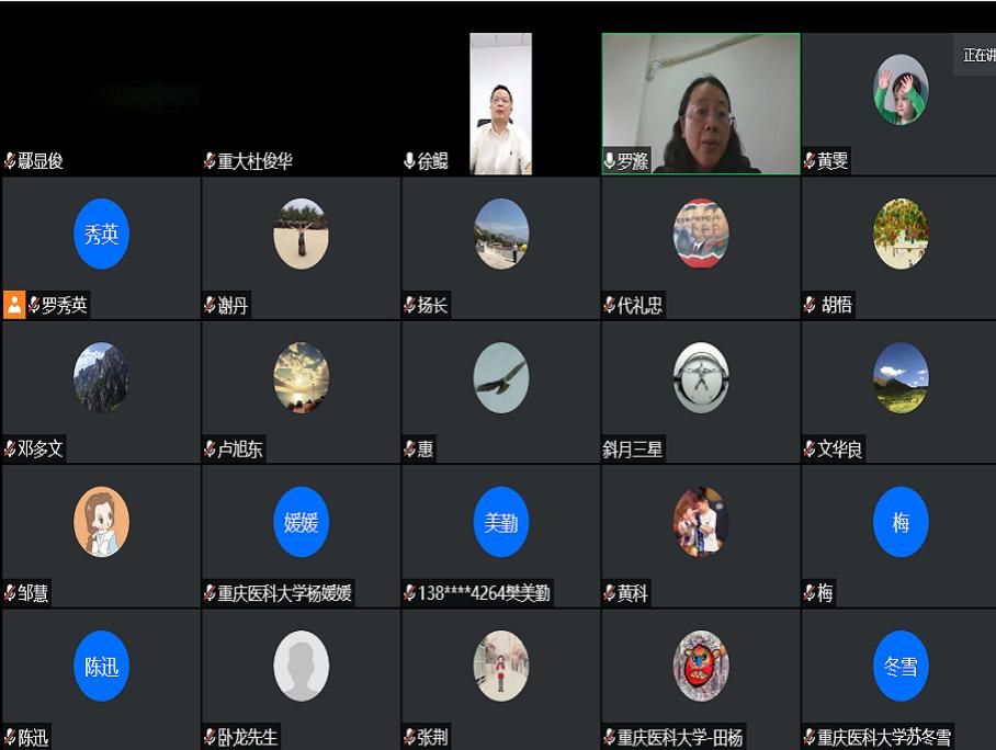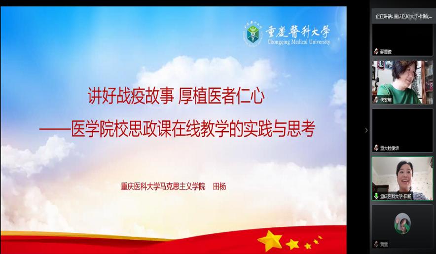 的田杨老师。她发言的题目是“讲好战疫故事,厚植医者仁心——医学院校思政课在线教学的实践与思考”。她分享了本次新冠疫情期间重庆医科大学马院如何在在线教学中以教材为基础,在加强理论讲授的同时,紧密结合抗疫现实,解读以习近平同志为核心的党中央关于疫情防控的决策部署;分析中国抗疫彰显的中国特色社会主义制度的显著优势;讲述防疫战疫一线的感人故事,帮助广大医学生筑牢爱国主义理想和医学人文精神的宝贵经验。