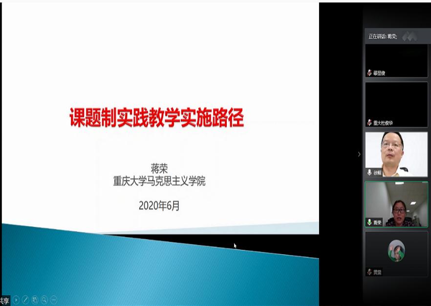 蒋荣老师,她发言的题目是“线上课题制实践教学实施路径探讨”。她认为“坚持理论与实际相结合,注重发挥实践环节的育人功能”是高校思想政治理论课建设体系创新计划的基本原则之一。探花视频