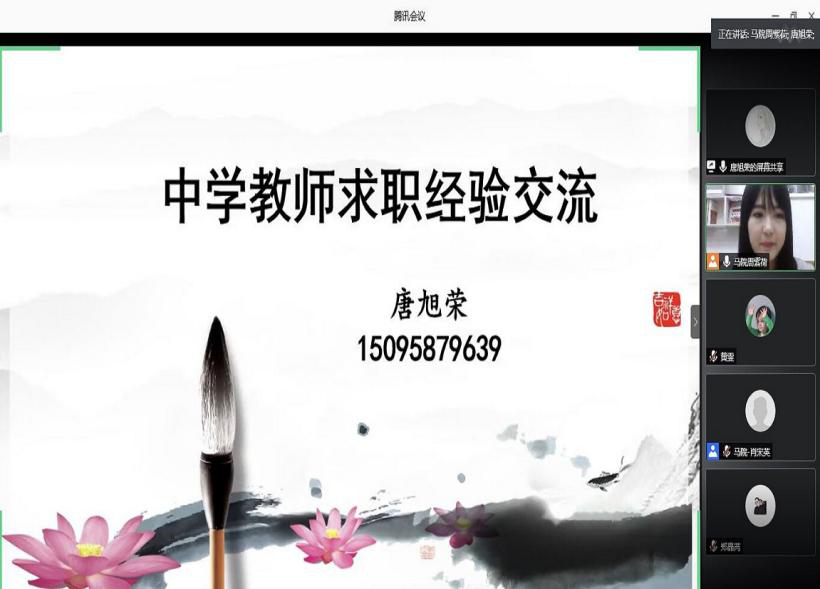 在“腾讯会议”分别举行了选调生和教师岗的求职经验交流会。本次分享交流会特邀成功考取选调生的蒋艺、李正超、谭小霞、卫婷婷以及即将入职教师岗位的兰青青、郑晶芮、唐旭荣等7位2020届毕业研究生同学进行就业经验分享。此次经验分享会共约120名同学参与。