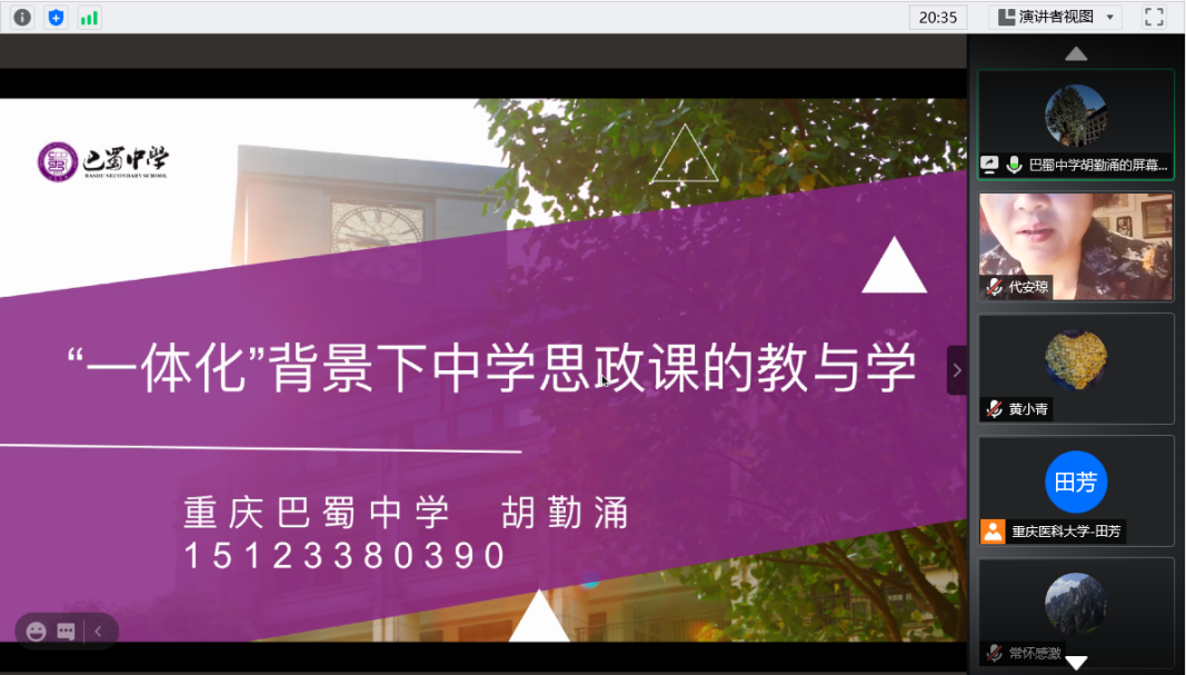 此次研讨会特邀了巴蜀中学的胡勤涌老师作了题为“‘一体化’背景下中学思政课的教与学”的主题发言。他详细介绍了中学思政课程的发展现状、思想政治学科的核心素养和思想政治课的内容。