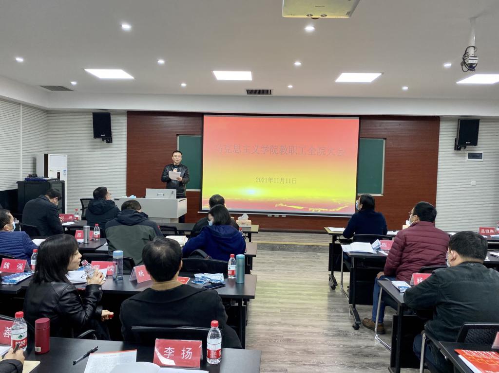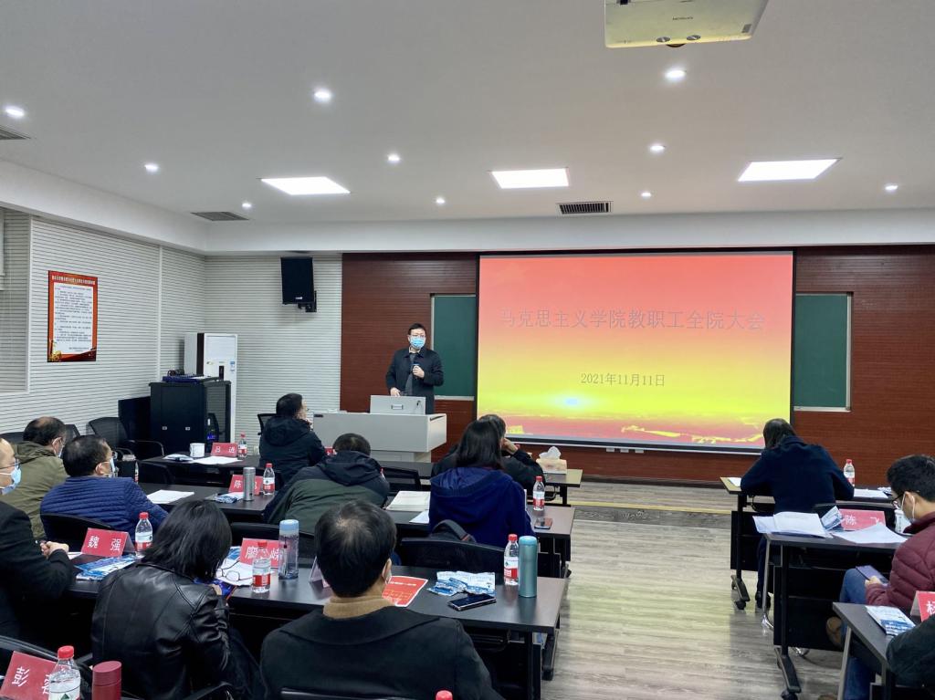 在406教室召开2021年度第八次全院教职工大会,学院领导班子、全院教职工参加会议。