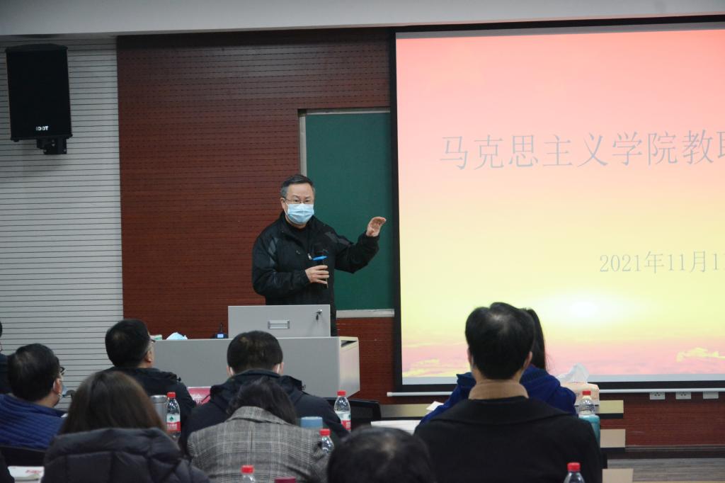 院长张邦辉首先要求各位教职工加强疫情常态化防护,他指出,当前,疫情防控形势十分严峻,广大干部职工要高度重视,提高政治站位,切实把疫情防控工作作为当前最紧要任务,要深刻认识到当前疫情防控工作的严峻性、复杂性、长期性,严格落实疫情防控措施。随后张院长通报了近期学院开展的公共课教学调研情况,他表示,学院会加大对教学工作的支持,充分调动各位老师的授课积极性,希望各位老师一起努力,按照中央巡视组、教育部要求,加强思想政治理论课课堂管理,提示教学质量。同时,张院长要求各位老师坚持教学与科研并重,加强科研项目申报与理论文章创作,争取出一批高质量、高水平科研成果,加强学院学科建设与科研发展。