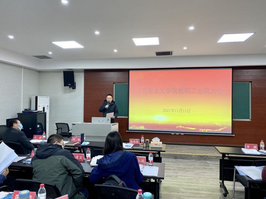 副院长吕进就《关于组织开展“七一”重要讲话精神、“四史”学习教育及弘扬红岩精神专题研究阐释工作的通知》《关于做好2022年国家社会科学基金项目申报有关工作的安排》文件精神进行了传达,要求各教研室、各位老师积极参与,切实围绕深化习近平新时代中国特色社会主义思想的研究,积极开展有学理深度和学术厚度的研究阐释。针对2022年国家社会科学基金项目申报有关工作,建议各位申报者开始初稿的撰写,学院会邀请校内外专家开展基金项目申报专题辅导,提出进一步完善意见。