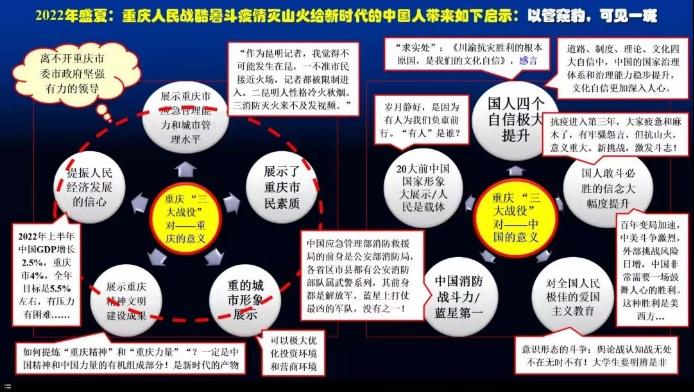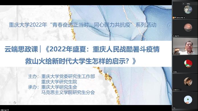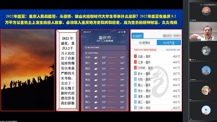 鄢显俊教授为马院师生上了一堂题为《2022年盛夏:重庆人民战酷暑斗疫情救山火给新时代大学生怎样的启示?》的云端思政课。课堂由探花视频