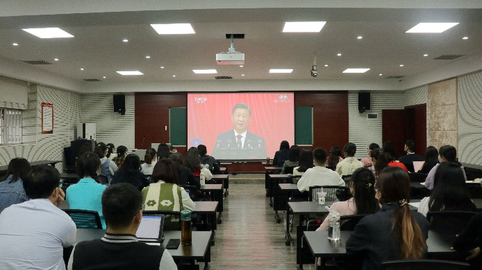 学院党委副书记温健琳表示,过去的五年,在党中央的坚强领导下,中华儿女克服了种种困难,以奋发有为的精神把新时代中国特色社会主义不断推向前进。在未来的新征程中,我们将会面临更大的风险和挑战,但只要全体中华儿女团结在以习近平同志为核心的党中央周围,就一定能战胜各种挑战和困难,从胜利走向胜利,实现第二个百年奋斗目标,实现中华民族伟大复兴的中国梦。