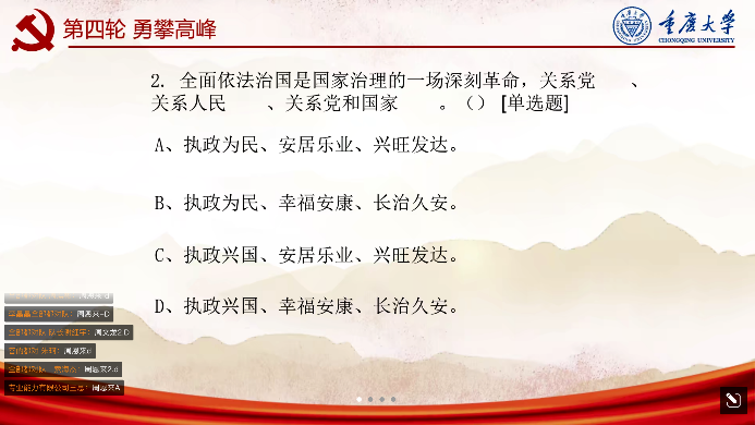 知识竞赛开始前,主持人张娅介绍了参赛队伍和竞赛流程。本次活动共分为“百花齐放”“勇往直前”“眼疾手快”“聚精会神”与“勇攀高峰”五个部分。题目紧密围绕中共一大到二十大党代会简史和党的二十大报告原文展开,涵盖党史、新中国史、改革开放史、社会主义发展史等方面。经过激烈的角逐,来自2021级、2022级的五支队伍分别获得此次比赛的一、二、三等奖。