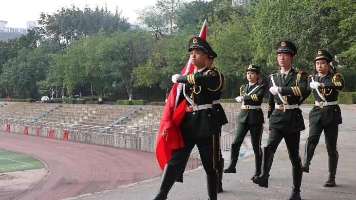 7时30分,国旗护卫队的同学们迈着整齐划一、铿锵有力的步伐,护送着五星红旗正步走向旗杆。伴随着庄严的国歌声,五星红旗冉冉升起,在熠熠晨光中迎风飘扬。全体学生肃立观礼,向国旗行注目礼。