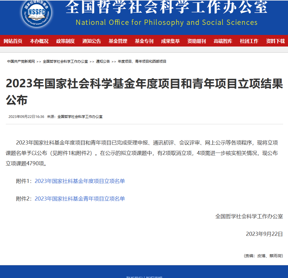 2023年9月22日下午,全国哲学社会科学工作办公室公布了2023年国家社科基金年度项目和青年项目立项结果名单。我院吕进、杨长福两位老师获国家社科基金年度项目立项,王超、廖钰获国家社科基金青年项目立项。立项信息如下: