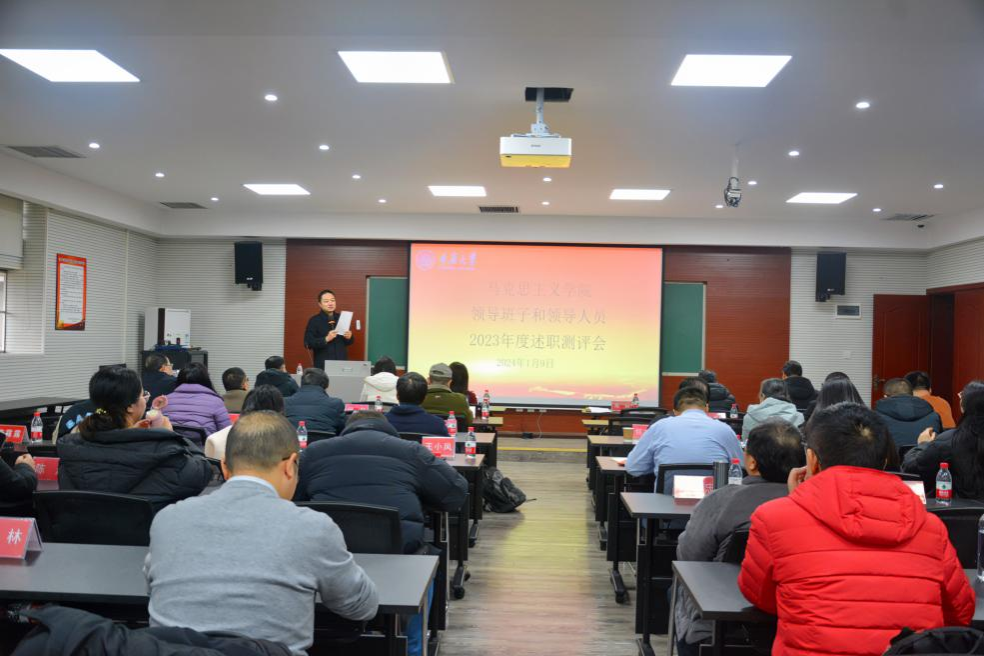 领导班子和领导人员2023年度述职测评会在学院406室召开。学校考核组人员校史办主任王琰、人事处师资科科长谢弋到会指导,马院领导班子及教职工出席大会,会议由马院党委书记陈科主持。