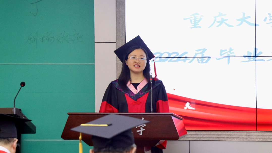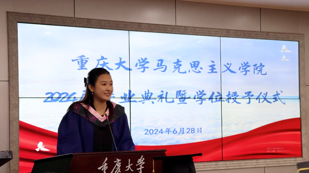 优秀毕业生代表何丽玲、易双、董瑞祺做毕业发言。她们就自己的求学经历和学业生活发表见解与感悟,表达了对学院精心培养、对母校无私关爱的真挚感谢,表示将时刻牢记“复兴民族、誓作前锋”的重大精神,守护与擦亮重大马院的闪亮名字,不负学院与母校的殷切期待,走好新的人生之路。