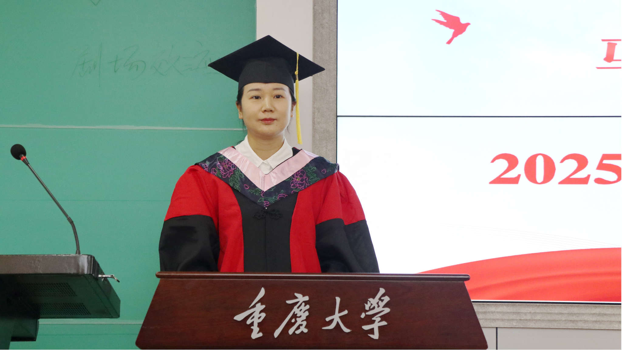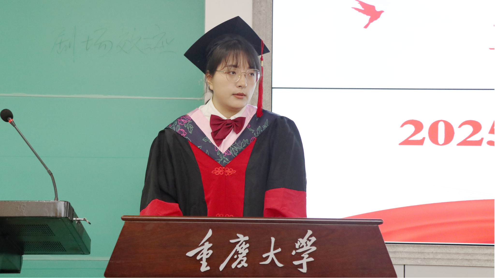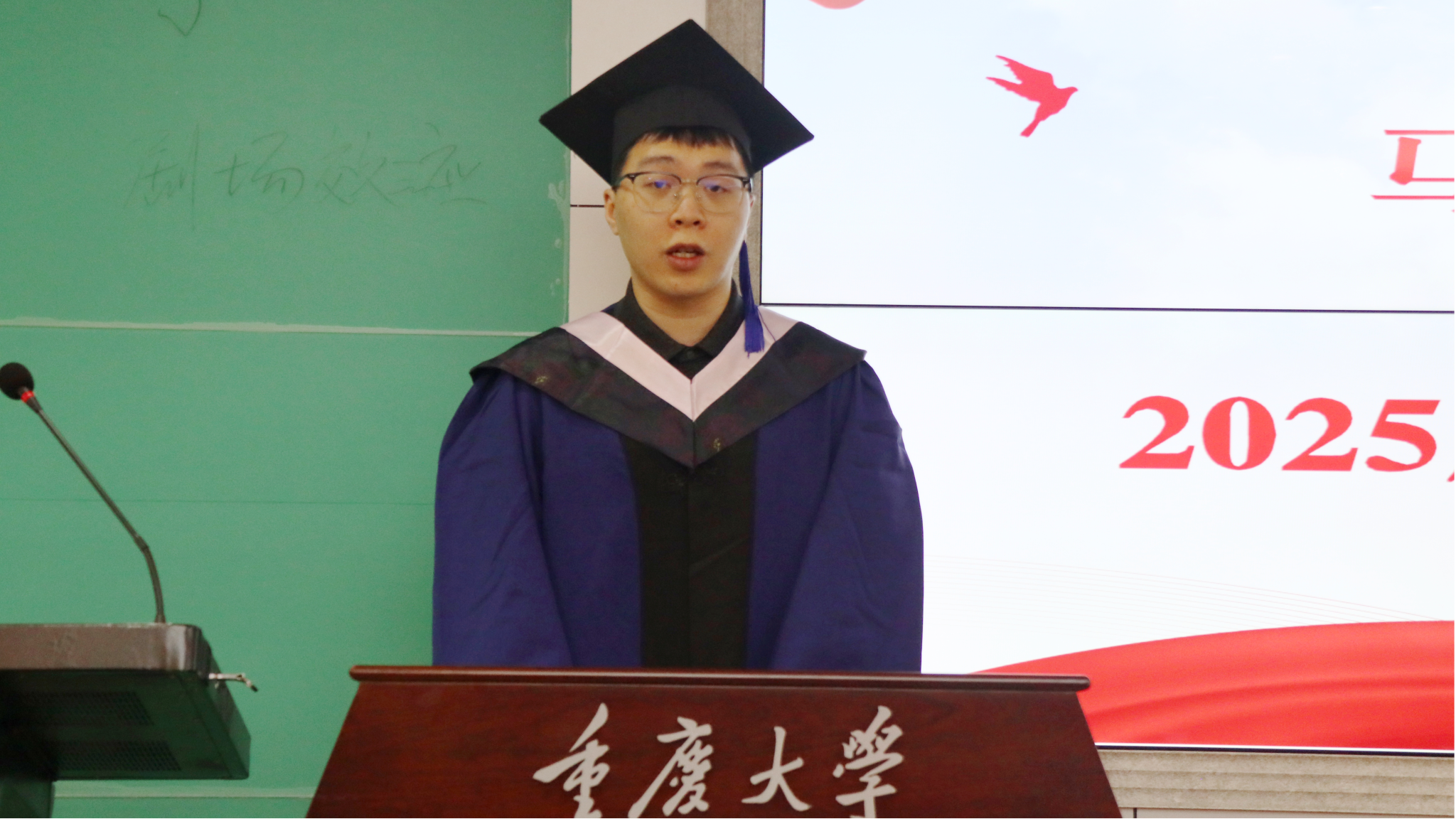毕业生代表熊彦彬(硕士)、曾荣灿(博士)分别作毕业发言。他们回顾了求学路上的种种感悟与成长,并代表全体毕业生向学院领导和全体导师致以衷心感谢。