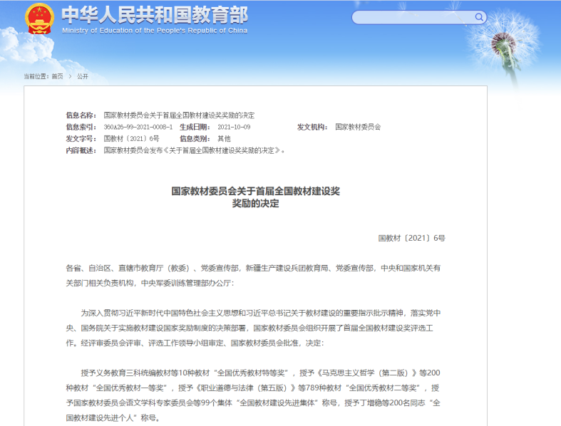 据悉,全国教材建设奖是教材领域的最高奖,是检阅、展示教材建设服务党和国家人才培养成果,增强教材工作者荣誉感、责任感,推动构建中国特色、世界水平教材体系的一项重大制度。