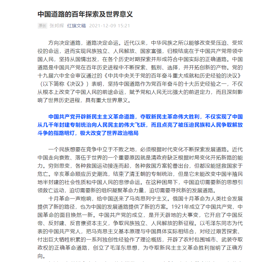 文章还写到:中国共产党开创、坚持和发展中国特色社会主义道路,不仅实现了中华民族从站起来到富起来的伟大飞跃,而且在经济上深刻改变了“东方从属于西方”的世界格局。中国共产党带领中国人民开创中国特色社会主义新时代,不仅迎来了从富起来到强起来的伟大飞跃,而且深刻影响了世界历史进程,使与资本主义的较量发生了有利于社会主义的重大转变;不仅走出中国式现代化道路,拓宽发展中国家走向现代化的路径,而且为解决人类问题贡献中国智慧