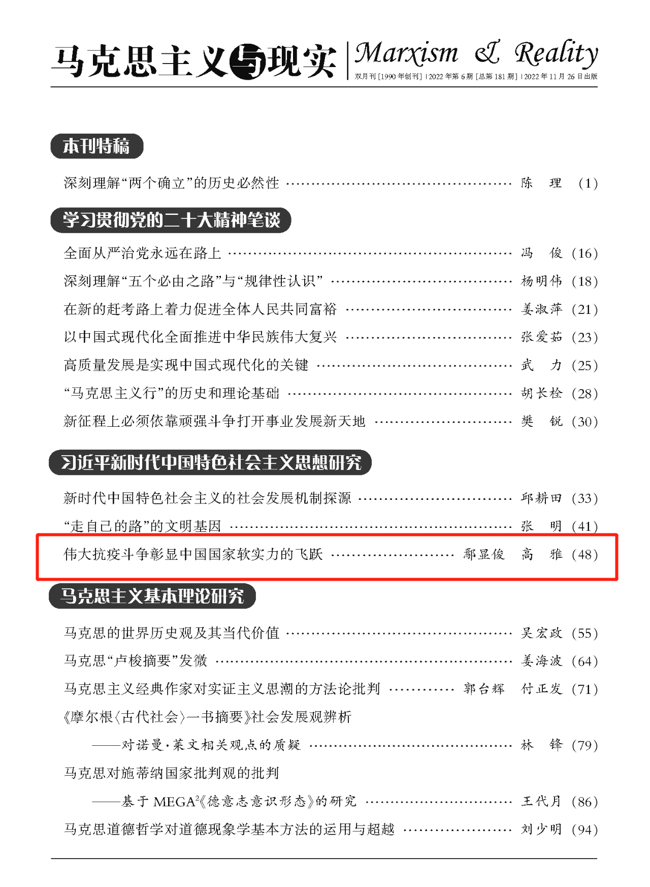 《马克思主义与现实》2022年第6期刊登了我院鄢显俊教授与2020级硕士研究生高雅合作的《伟大抗疫斗争彰显中国国家软实力的飞跃》一文,这是我院导师与研究生合作发表的首篇探花视频