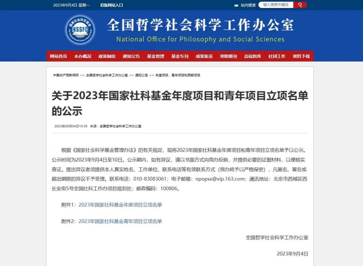 2023年9月4日,全国哲学社会科学工作办公室公示了2023年国家社科基金年度项目和青年项目立项名单。我院吕进、杨长福两位老师获国家社科基金年度项目立项,王超、廖钰获国家社科基金青年项目立项。立项信息如下: