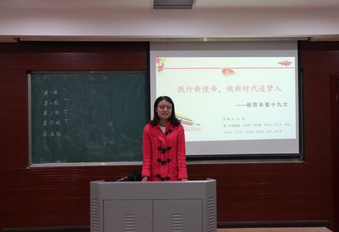 此次读书活动以小组为单位,由每小组代表分别作分享并提出问题与大家一起讨论。第一组苏倩觎同学从马克思主义经典作家关于青年的论述出发,以“携手经典,展望新征程”为主题探讨了青年价值观和青年发展观。第二组周婷玉同学主要从新青年的重要作用、重要地位和如何成就新青年三个方面讲述了新青年的主动作为。第三组周琳同学以“践行新使命,做新时代追梦人”为主题,结合学习《习近平七年知青岁月》心得阐释了青年团体在新时代应具备的理想追求、价值取向、历史使命。第四组何佳佳同学以从习近平系列重要讲话为切入点,从重视青年的核心内容、明确青年的价值取向、青年应坚持的基本原则三个维度论述了如何为实现中国梦凝聚青春力量,并根据分享内容抛出了 “为什么广大青年要坚持群众观点、群众路线?”这一问题与大家讨论,引发了在场同学的深深思考。第五组黄美玲同学从马克思、毛泽东、习近平三个人的著作、讲话中论述青年的思想,她认为:青年人要坚定理想信念,志存高远;脚踏实地,勇做时代的弄潮儿;在实现中国梦的生动实践中放飞青春梦想,在为人民利益的不懈奋斗中书写人生华章!